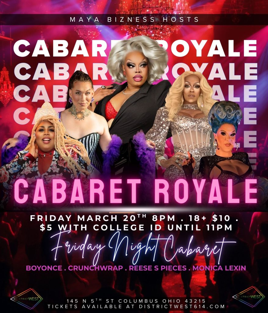 Step into the glamor of Cabaret Royale, a Friday night cabaret hosted by Maya Bizness and packed with bold performances, big personalities, and nonstop energy. Featuring Boyonce, Crunchwrap, Reeseās Pieces, and Monica Lexin, this is your invitation to start the weekend with dazzling drag, fierce entertainment, and a whole lot of District West magic.